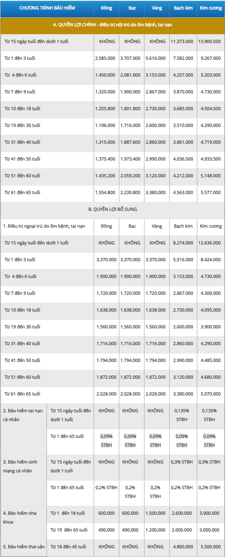 BẢNG BIỂU PHÍ BẢO HIỂM BẢO VIỆT AN GIA